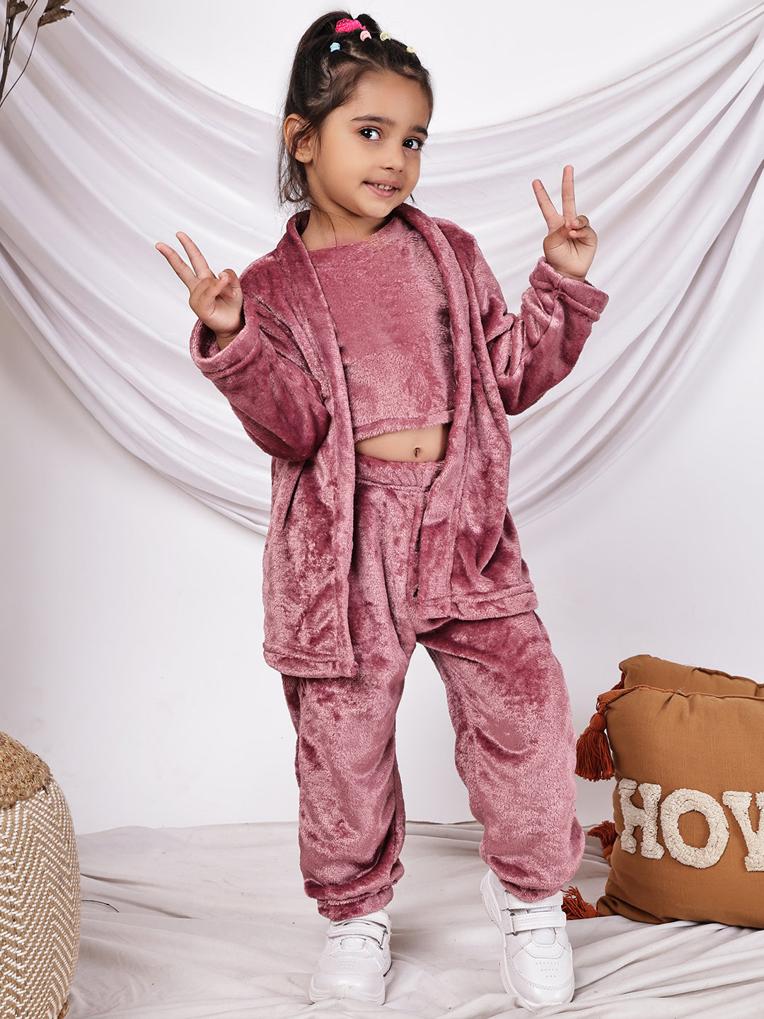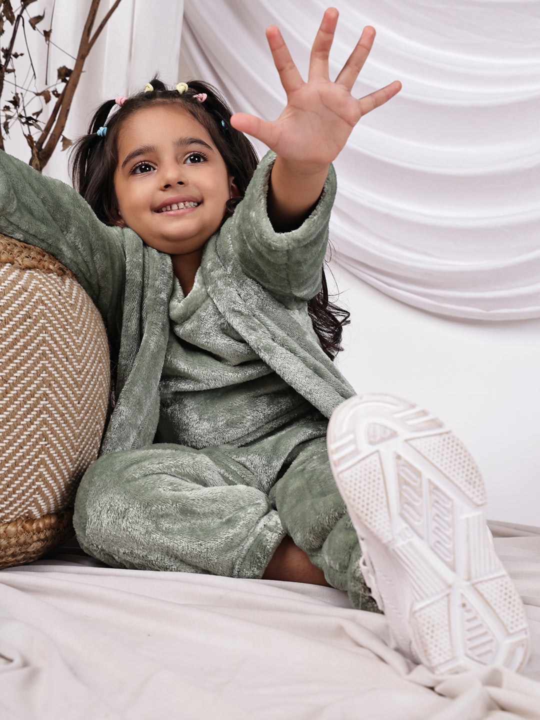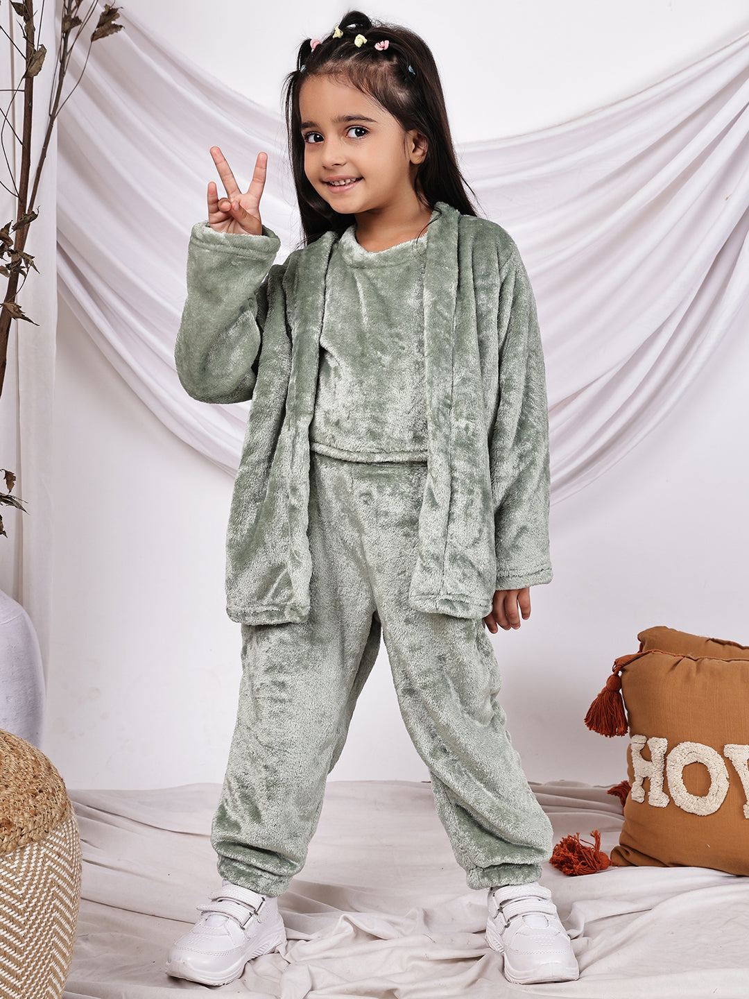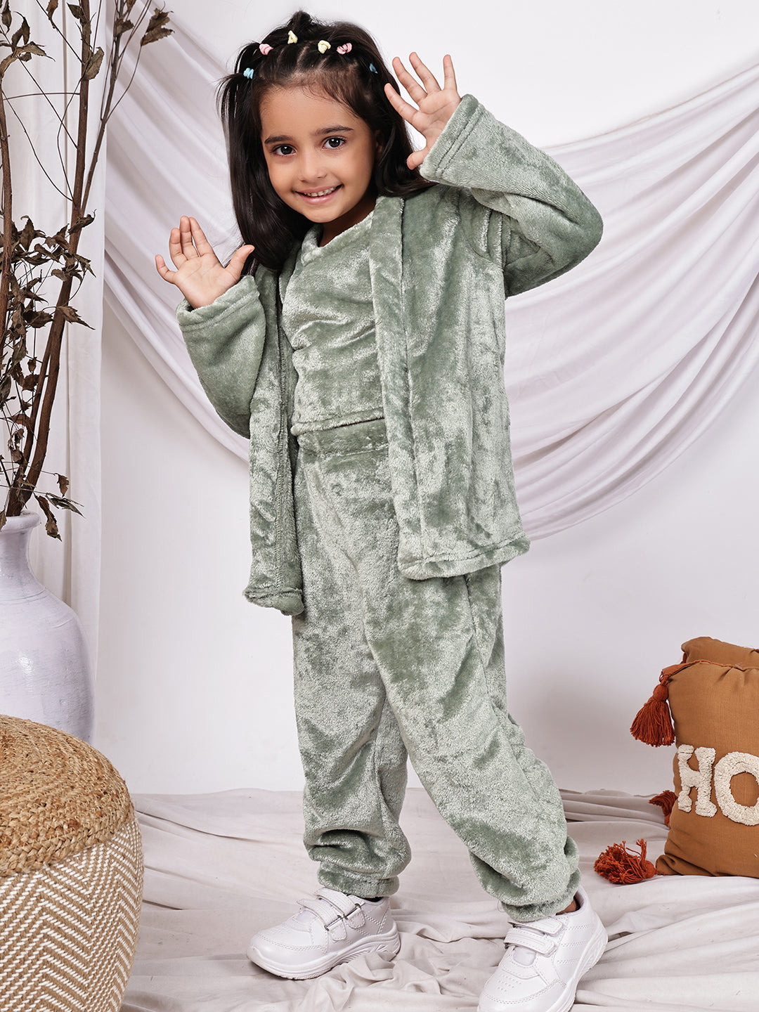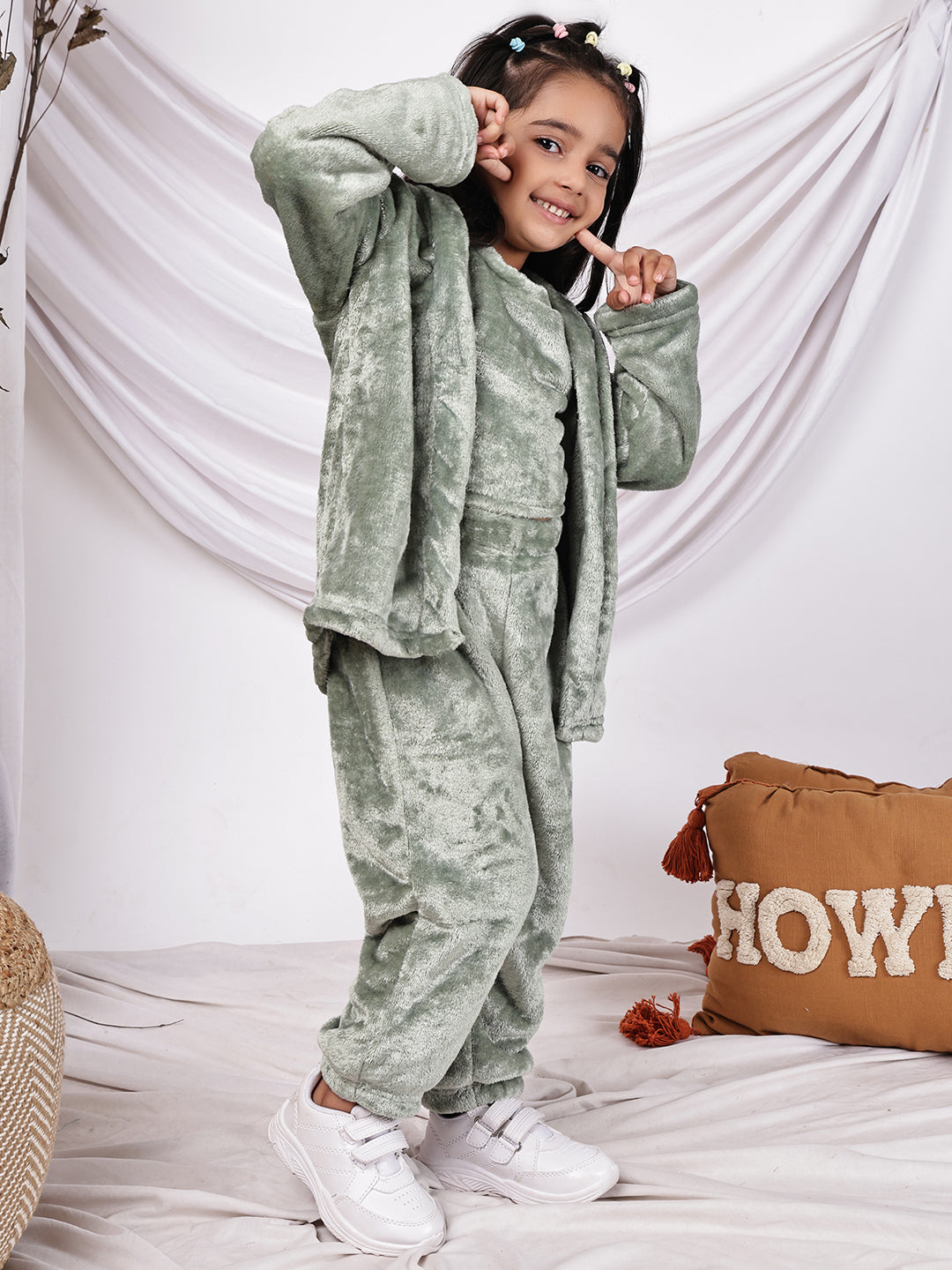 Cozy up in style with this luxurious girls' co-ord set featuring a cami top, shrug, and trousers. Crafted from soft, plush fleece fabric, this ensemble offers unparalleled comfort and warmth. The cami top and shrug boast a flattering round neckline, while the full-length sleeves provide ample coverage. The trousers complete the look with a relaxed fit, ensuring unrestricted movement. Perfect for lounging at home or running errands, this versatile set effortlessly blends fashion and functionality. Available in a vibrant Green hue, it adds a pop of colour to any wardrobe. Designed with meticulous attention to detail, this co-ord set is a must-have for any fashion-forward young lady seeking both style and comfort.