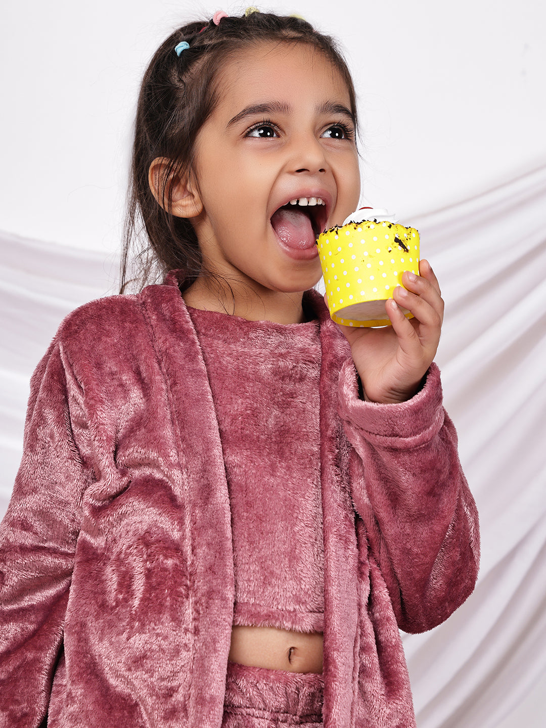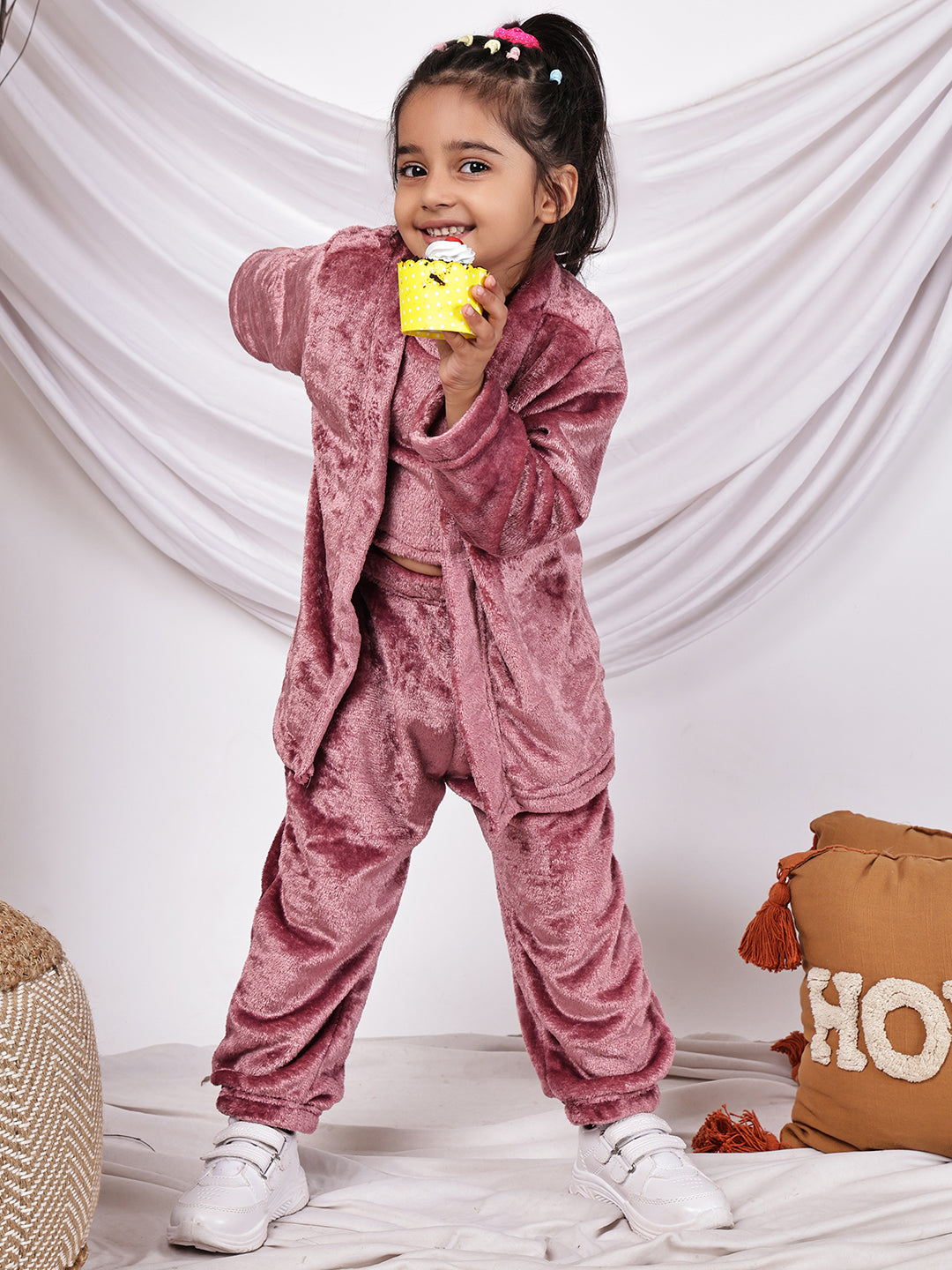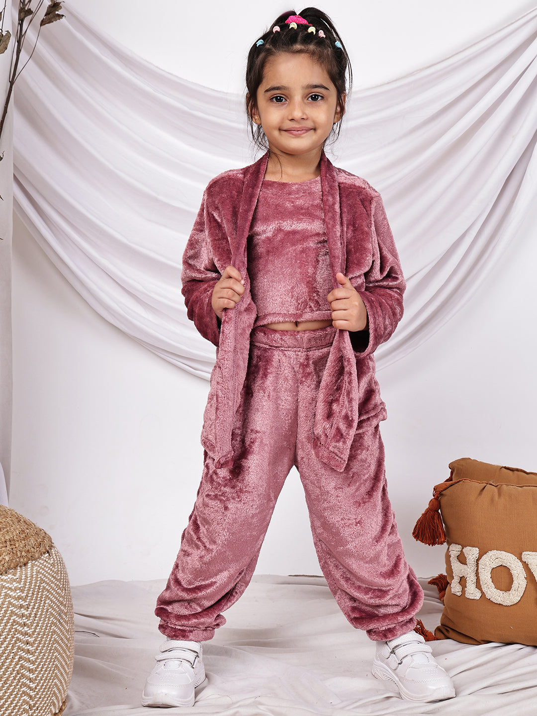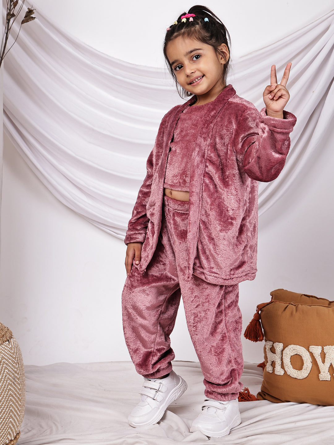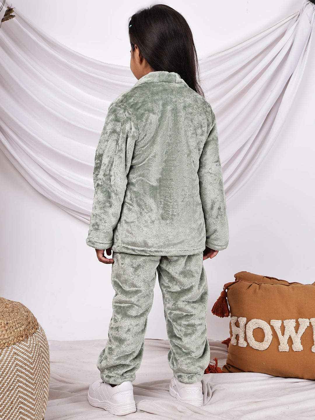 Cozy up in style with this luxurious girls' co-ord set featuring a cami top, shrug, and trousers. Crafted from soft, plush fleece fabric, this ensemble offers unparalleled comfort and warmth. The cami top and shrug boast a flattering round neckline, while the full-length sleeves provide ample coverage. The trousers complete the look with a relaxed fit, ensuring unrestricted movement. Perfect for lounging at home or running errands, this versatile set effortlessly blends fashion and functionality. Available in a vibrant Green hue, it adds a pop of colour to any wardrobe. Designed with meticulous attention to detail, this co-ord set is a must-have for any fashion-forward young lady seeking both style and comfort.