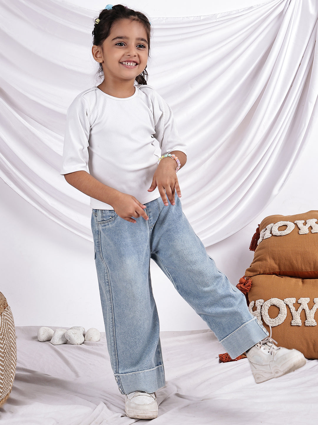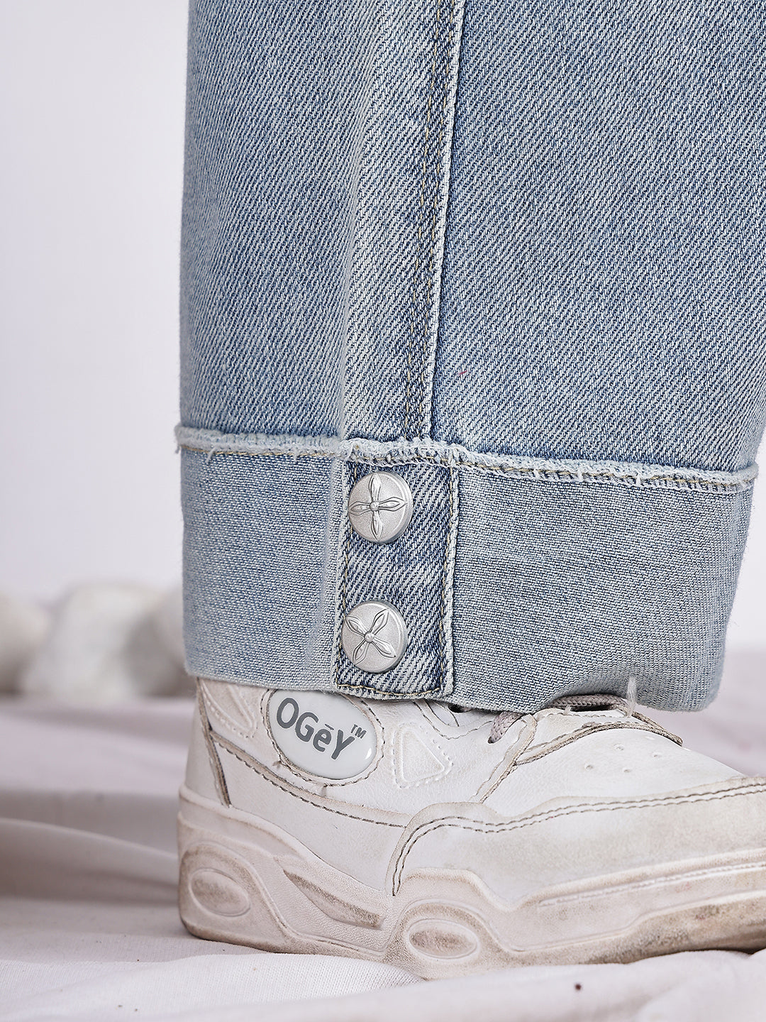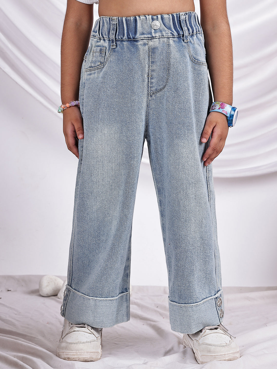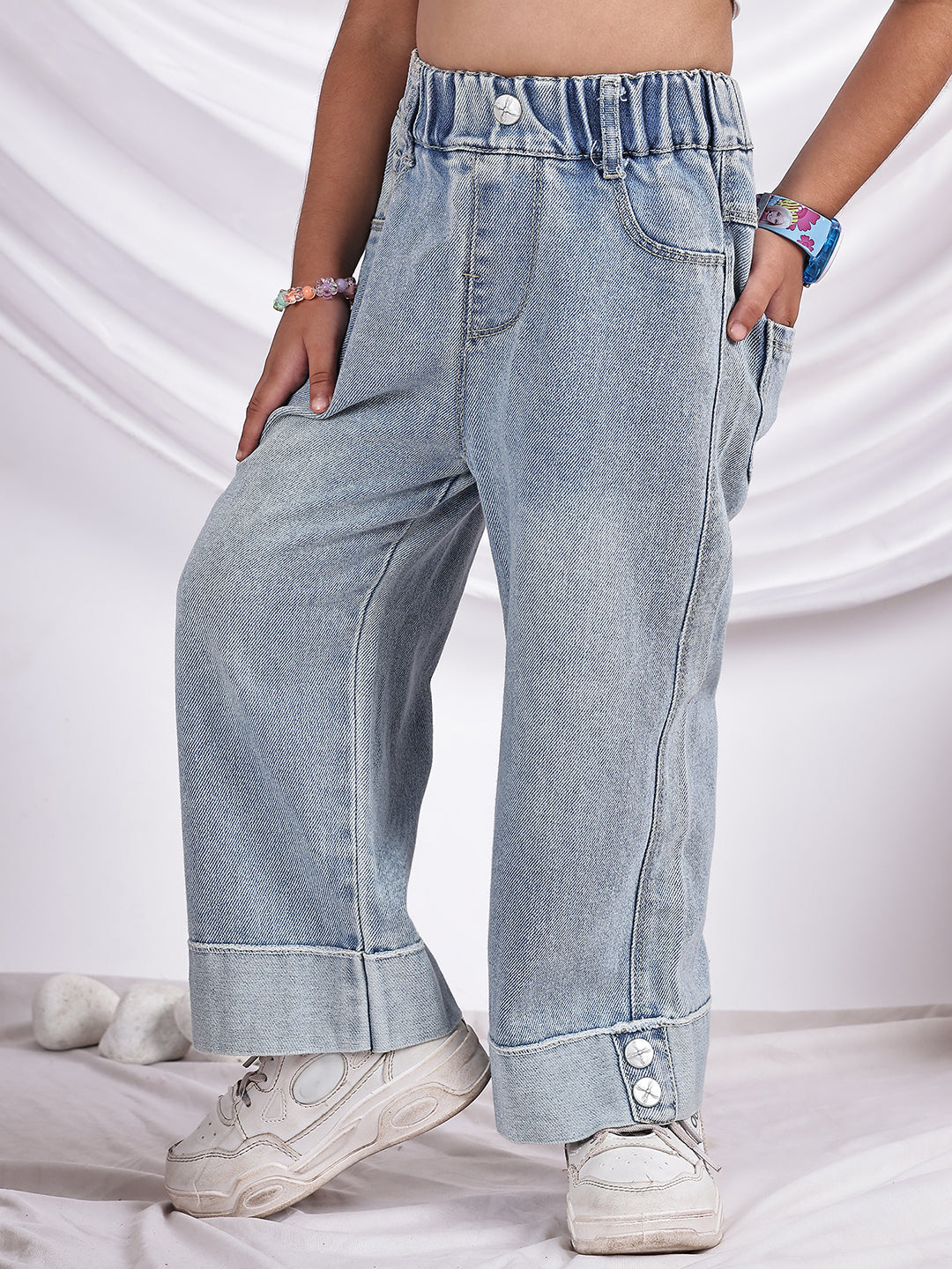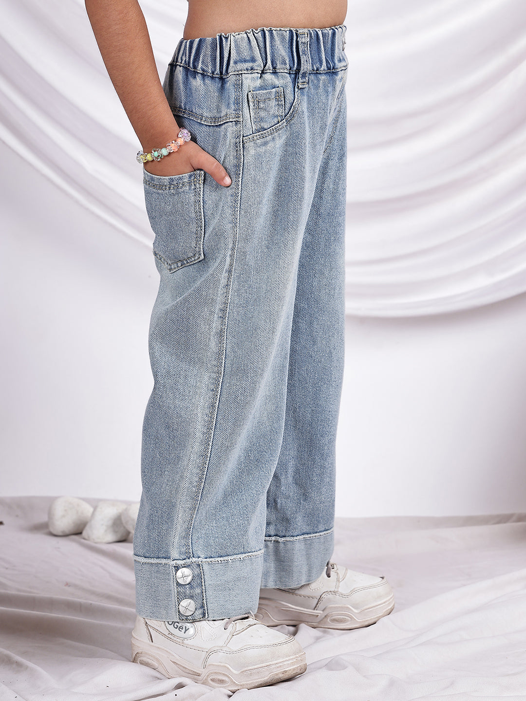 Girls Light Blue Denim Trousers with Button Cuffs, Casual Style