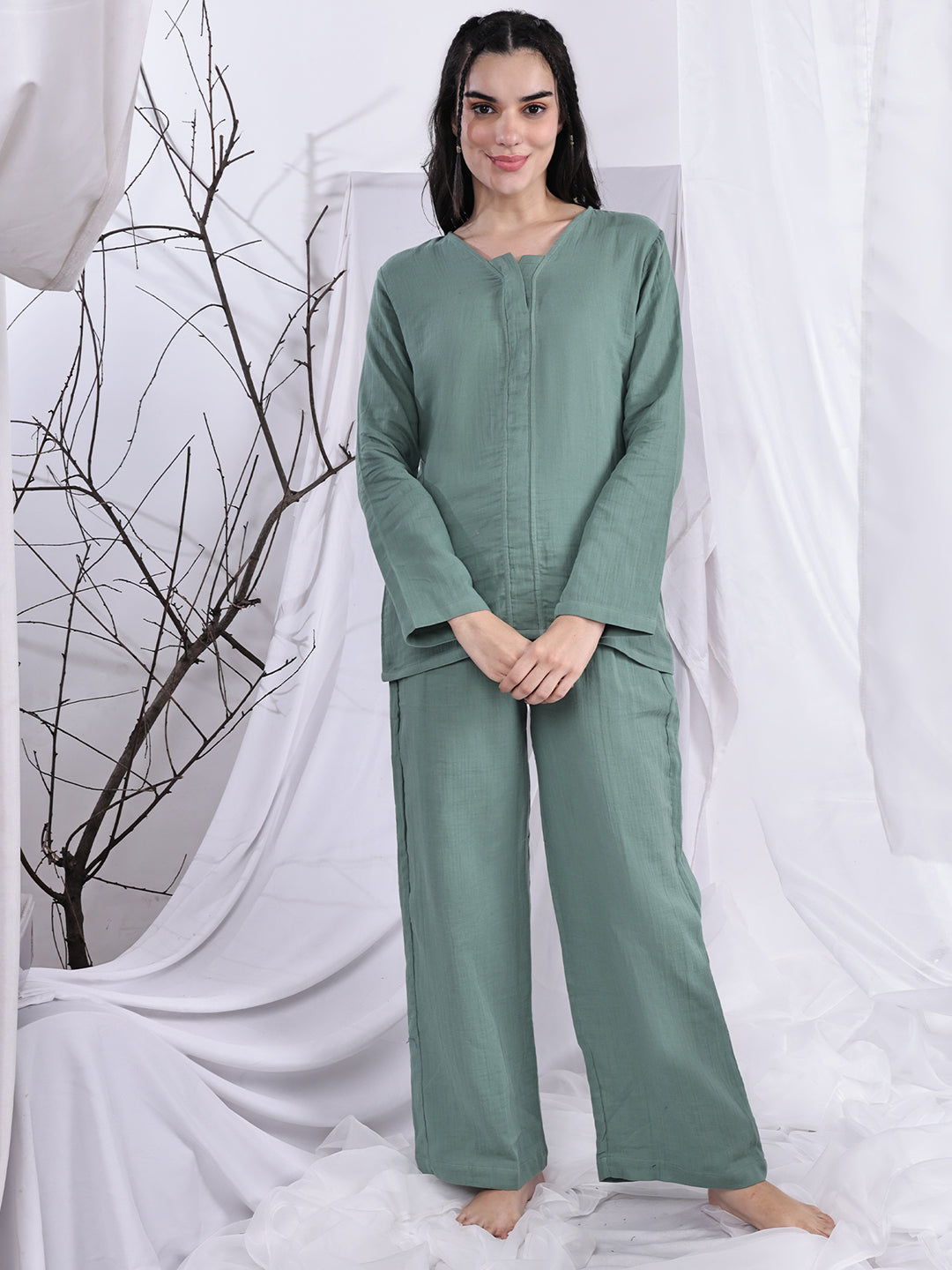 Discover ultimate comfort with this elegant cotton loungewear set in a stunning turquoise blue. The ensemble features a thoughtfully designed long-sleeve top with a flattering V-neck and relaxed fit, paired perfectly with coordinating full-length pants. The breathable cotton fabric ensures comfort throughout your lounging hours, while the loose-fitting silhouette allows unrestricted movement. The top's subtle split neckline adds a touch of style, complemented by the straight-cut pants with a comfortable elastic waistband. This versatile nightsuit works wonderfully for both sleeping and casual lounging. The premium cotton construction offers the right balance of softness and durability, making it ideal for year-round wear. The beautiful turquoise shade brings a fresh, calming presence to your loungewear collection. Perfect for those who appreciate both comfort and aesthetics in their nightwear.