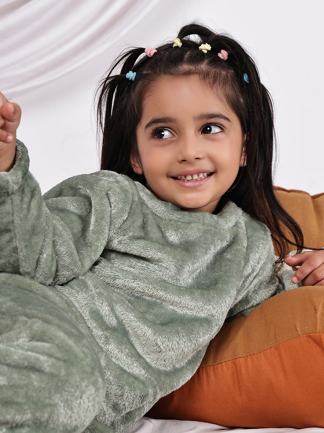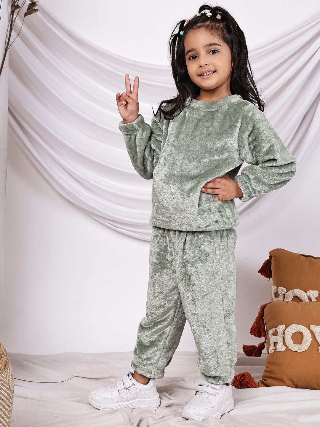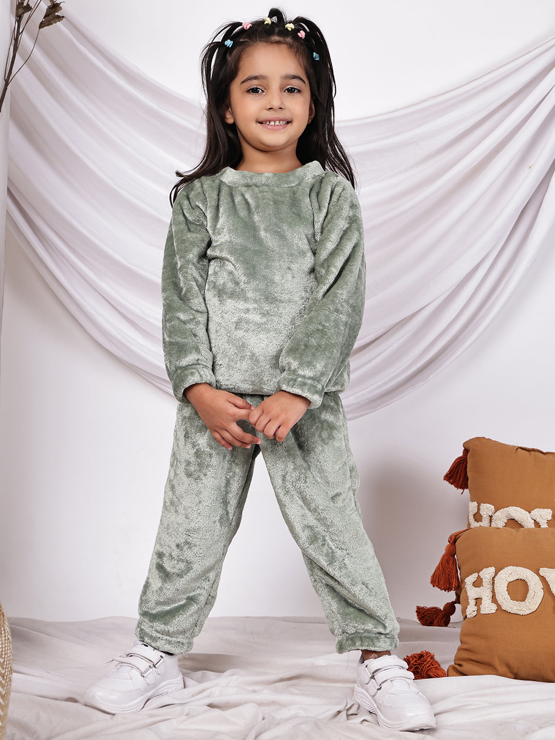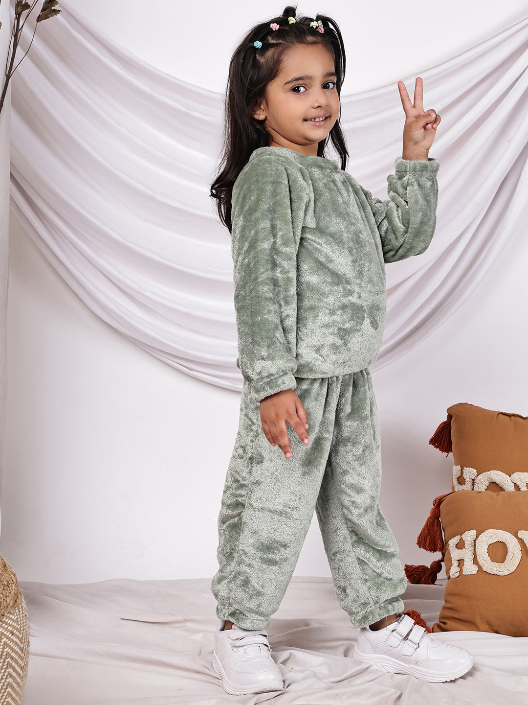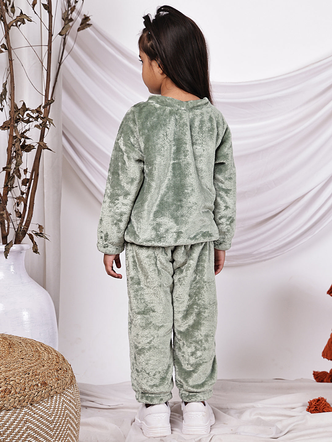 Wrap your little one in cosy comfort with this delightful Move fleece co-ord set. The full-sleeved round neck top pairs perfectly with matching trousers, creating an adorable coordinated look. Crafted from soft fleece material, this outfit provides warmth while allowing freedom of movement for active kids. The round neckline offers easy dressing, while the full-length sleeves and trousers ensure complete coverage. Perfect for casual outings, lounging at home, or as sleepwear during cooler months, this versatile set combines style with practicality. The soothing sage Move colour adds a contemporary touch to your child's wardrobe. The elastic waistband on the trousers ensures a secure, comfortable fit. This charming co-ord set makes for an excellent addition to your little one's casual wear collection, offering both comfort and style in one ensemble.