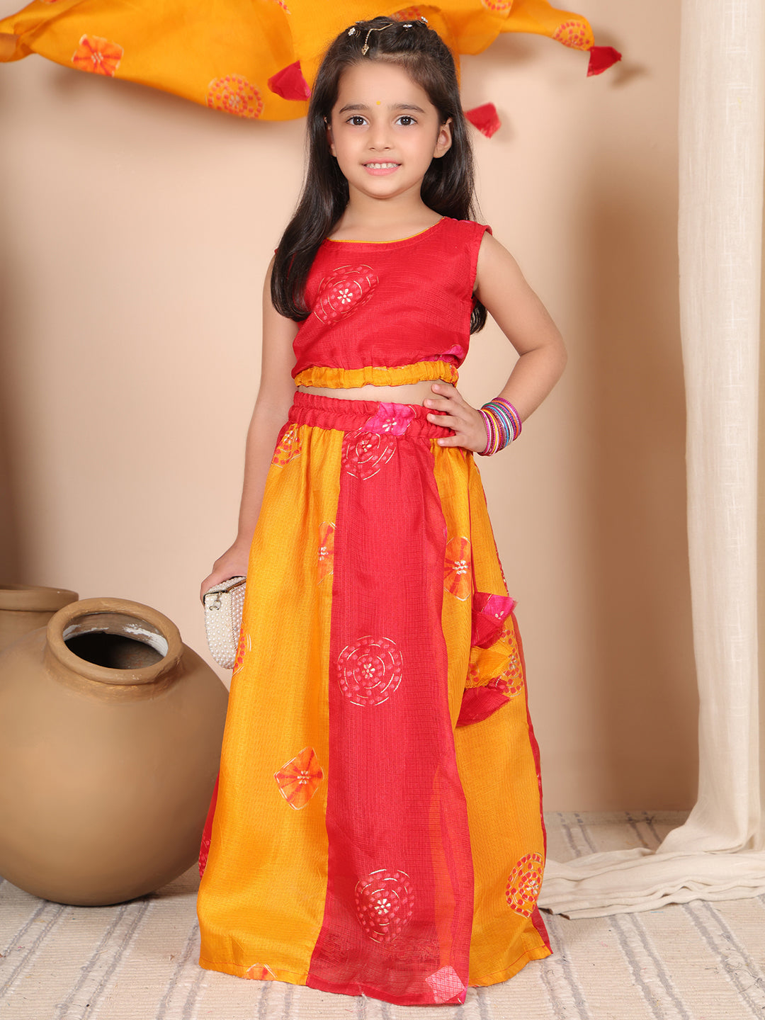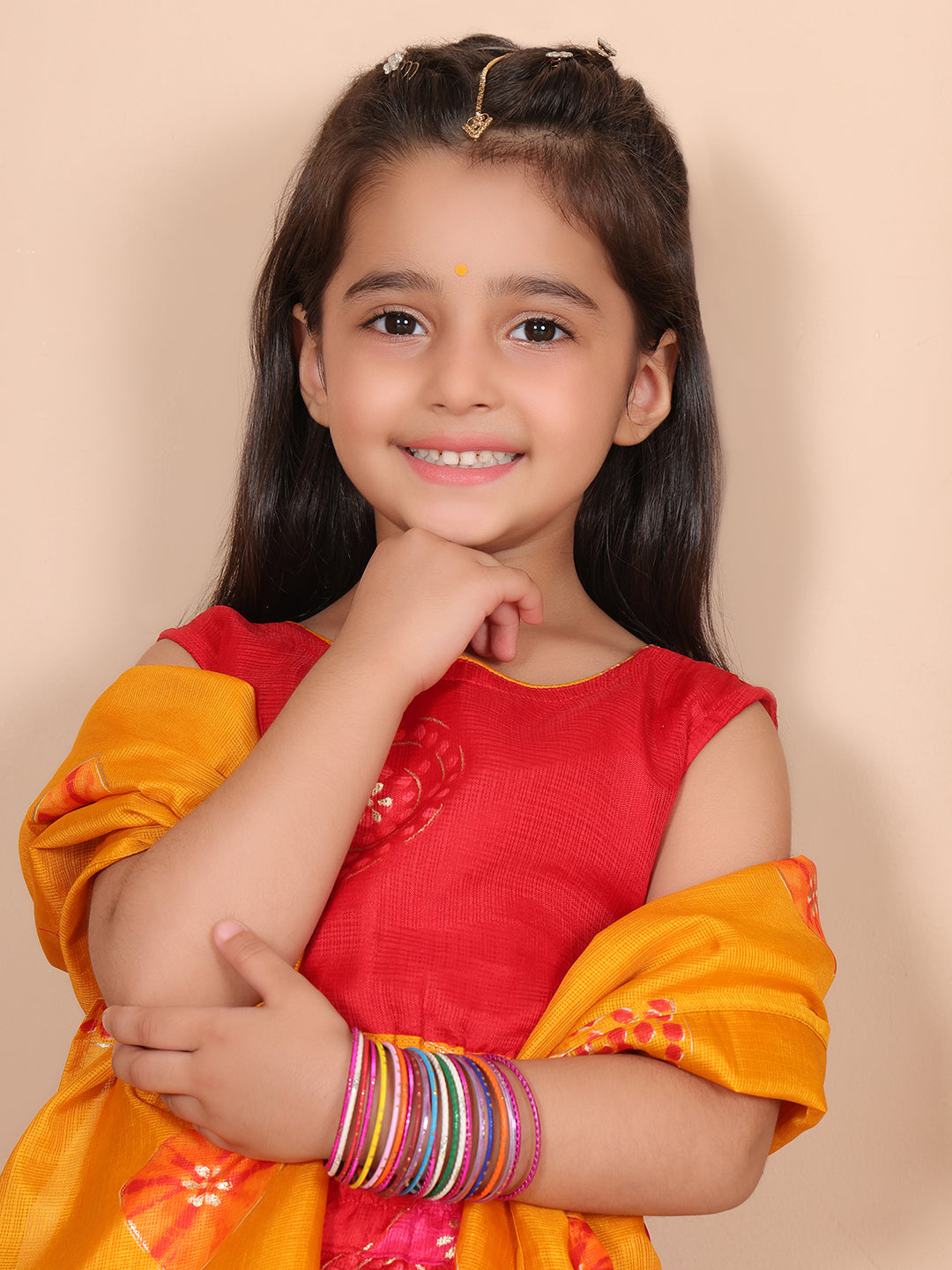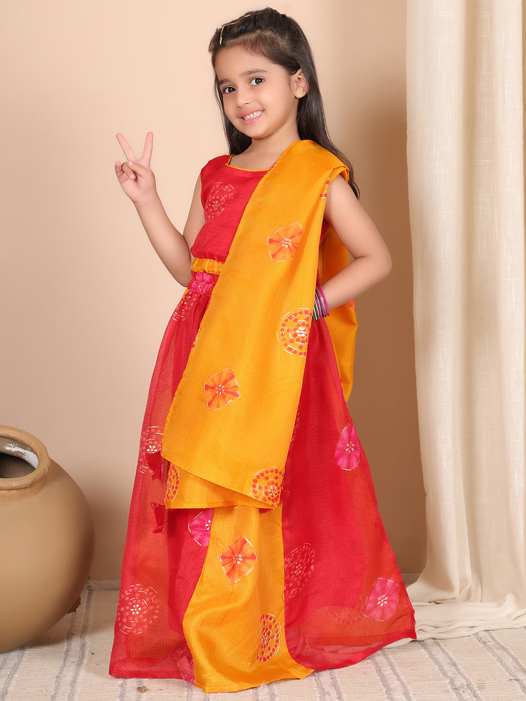 The beautiful combination of red and yellow creates a striking traditional look. The set features a sleeveless choli (top) with elegant printed motifs, paired with a matching lehenga (skirt) that flows gracefully. The ensemble includes a coordinating dupatta that adds the perfect finishing touch. Crafted from comfortable cotton blend fabric, this ethnic wear is ideal for both casual and festive occasions. The printed patterns throughout the outfit showcase intricate traditional designs that enhance its cultural appeal. This versatile set can be accessorised with traditional jewellery to complete the look.