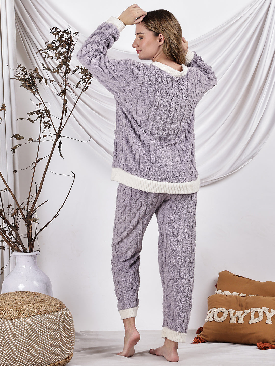 Cable Knit Loungewear Set, Two-Piece Winter Nightsuit with Decorative Applique