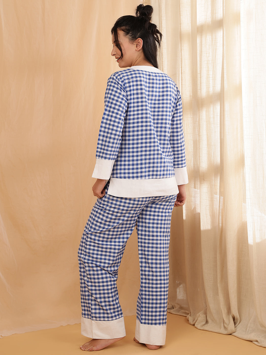 Comfort with this Women’s Checkered Nightsuit Set, designed to keep you relaxed all night long. The soft, breathable fabric feels gentle on the skin, while the classic blue and white check pattern gives a fresh and calming look. Featuring a V-neck top with contrast detailing and matching pyjamas with an elasticated waistband, this set is perfect for bedtime, lounging, or slow weekend mornings.