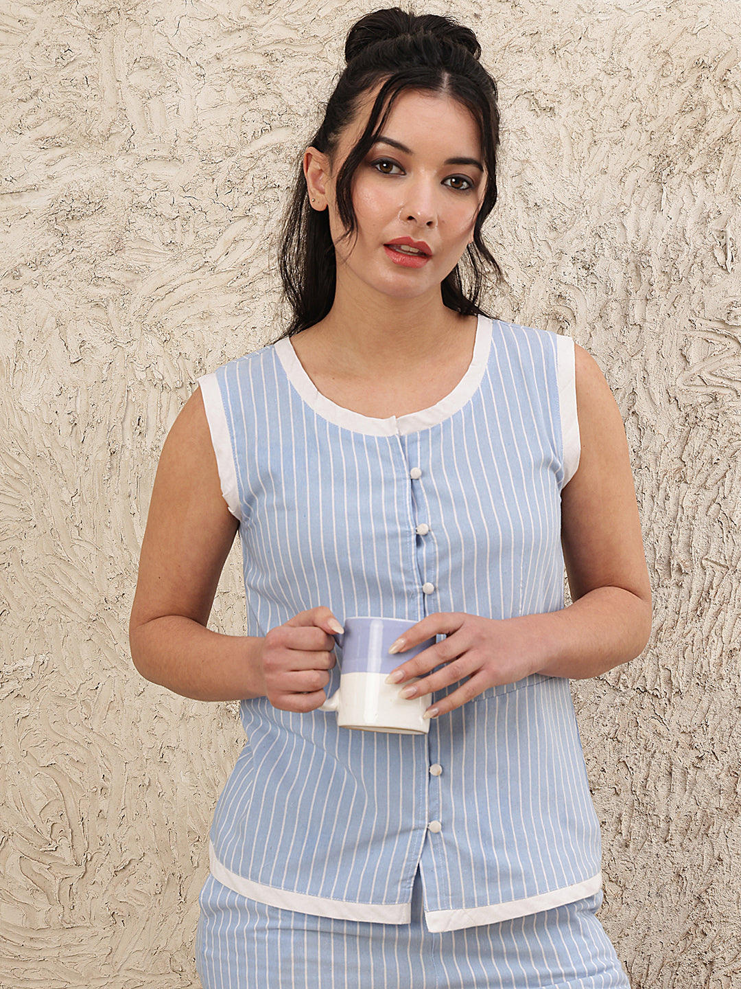 Stay relaxed and stylish with this Women’s Nightsuit Set, featuring a sleeveless striped top paired with matching pyjamas. Designed for comfort and ease, the lightweight fabric ensures breathability while the relaxed fit allows free movement. A perfect blend of comfort and minimal style for restful nights and cozy mornings.