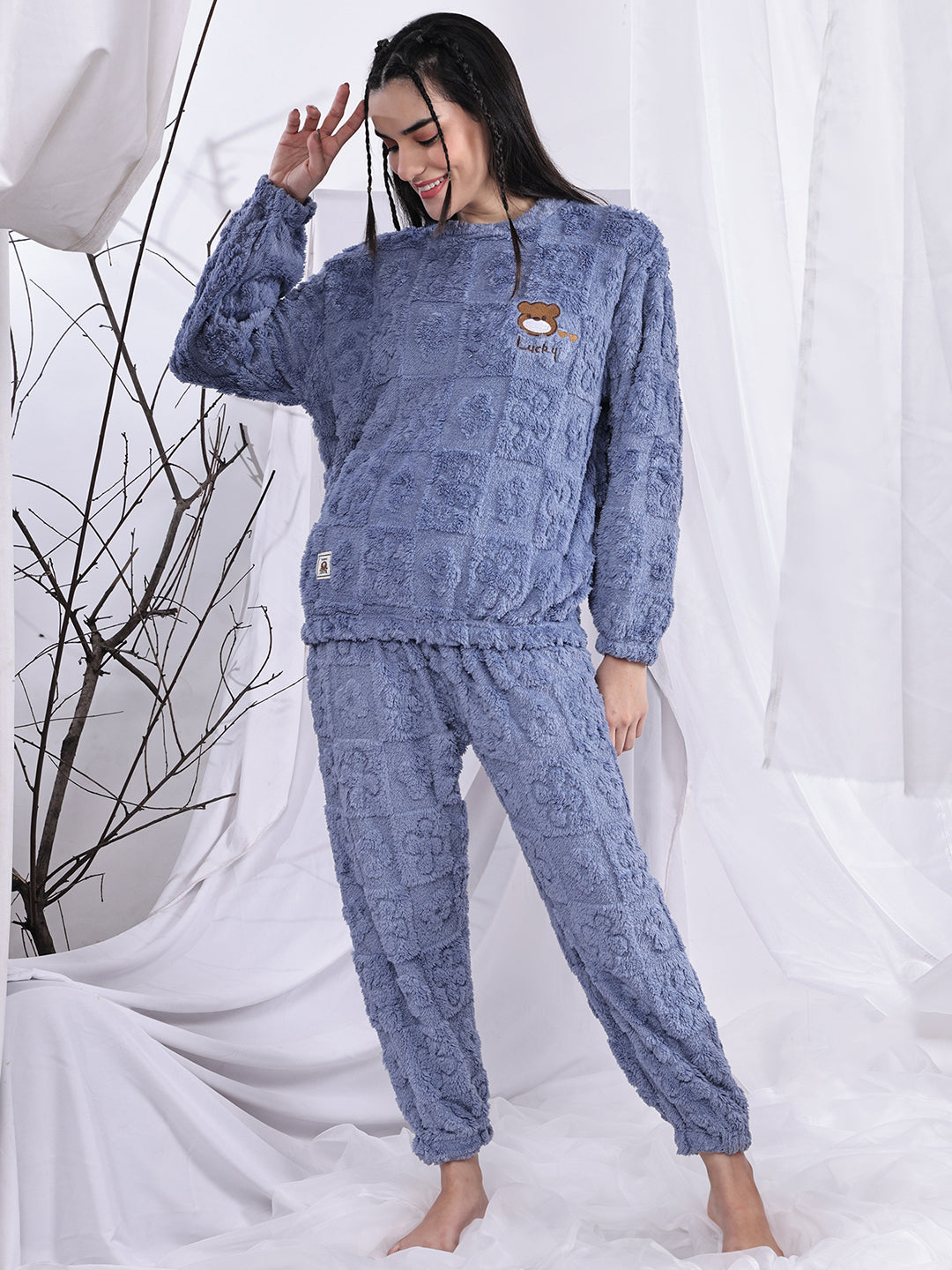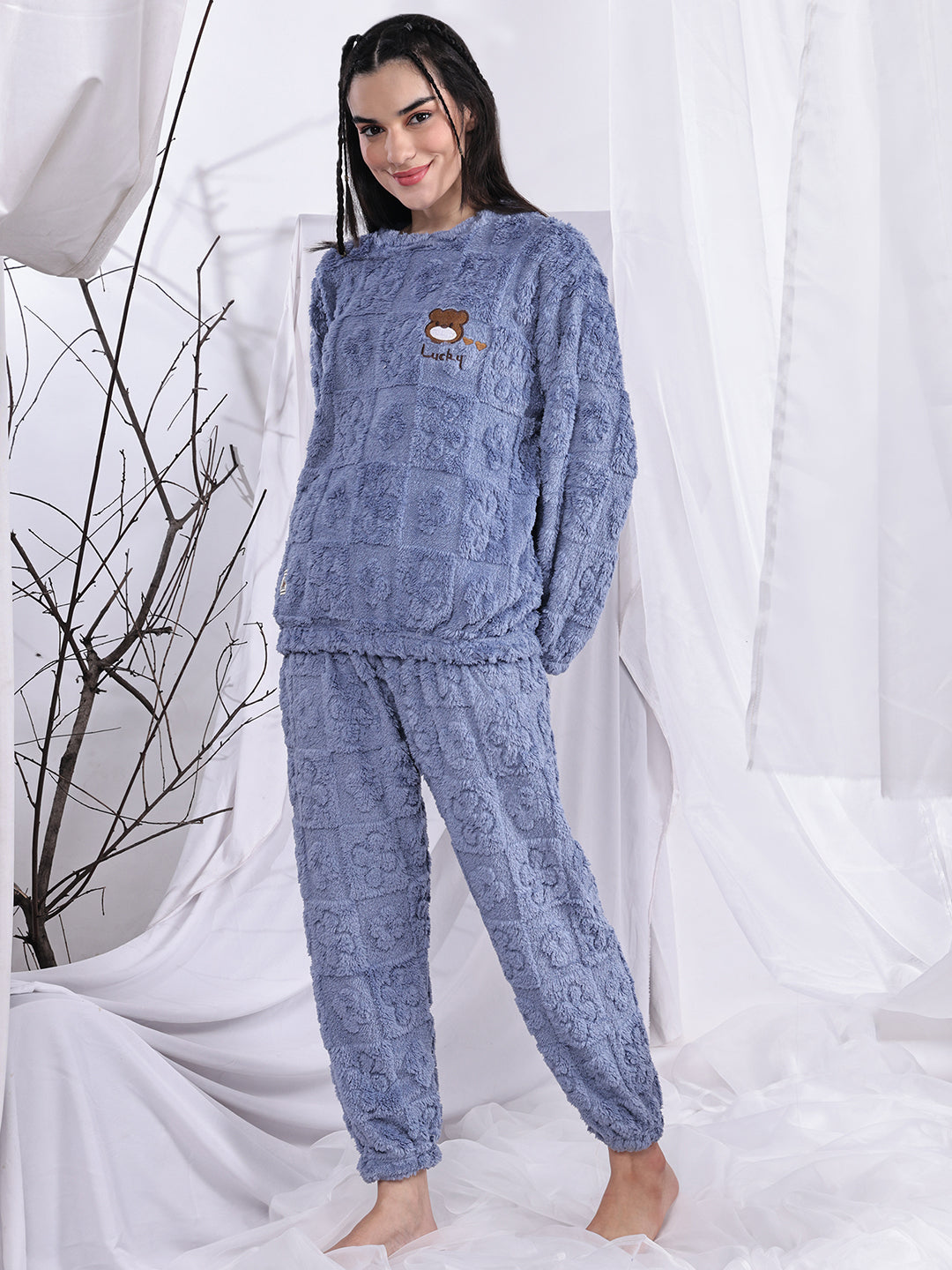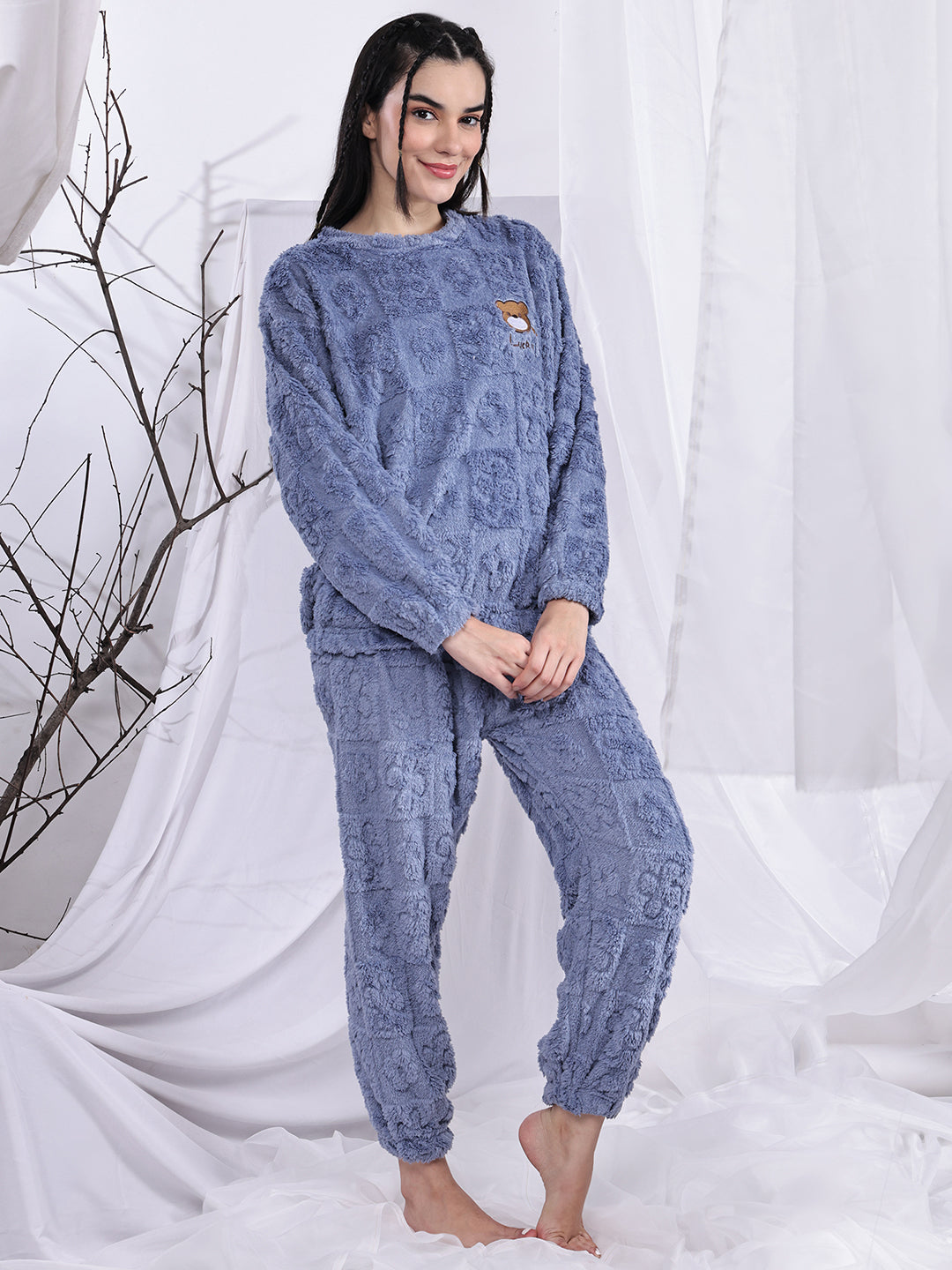 Wrap yourself in luxurious comfort with this plush fleece nightsuit in a beautiful shade of blue. This cosy two-piece set features a textured pattern throughout, creating a sophisticated yet relaxed look. The long-sleeve top is adorned with an adorable bear embroidery detail, adding a playful touch to the ensemble. The matching jogger-style bottoms feature elastic cuffs for a snug fit. Crafted from soft, textured fleece material, this nightsuit offers warmth and comfort for lounging or sleeping. The elastic waistband ensures a comfortable fit, while the overall relaxed silhouette allows for easy movement. Perfect for chilly evenings or year-round comfort, this nightsuit combines style with functionality. The set is easy to care for and maintains its plush texture wash after wash. Available in various sizes, this nightwear set makes an excellent addition to your loungewear collection.