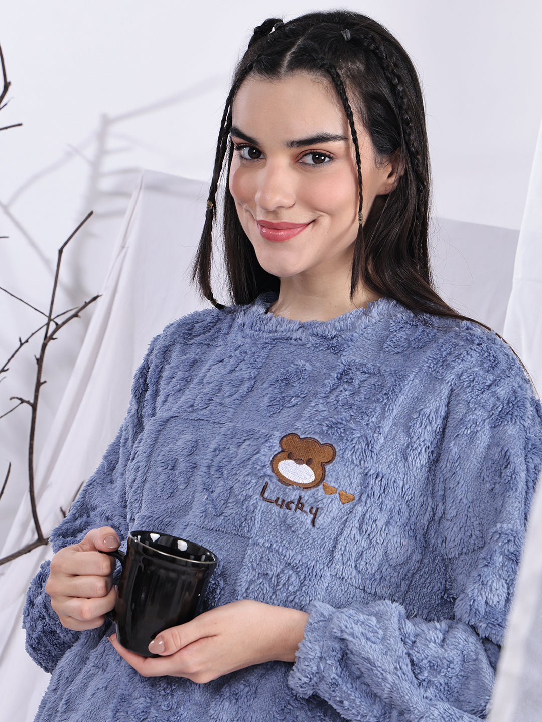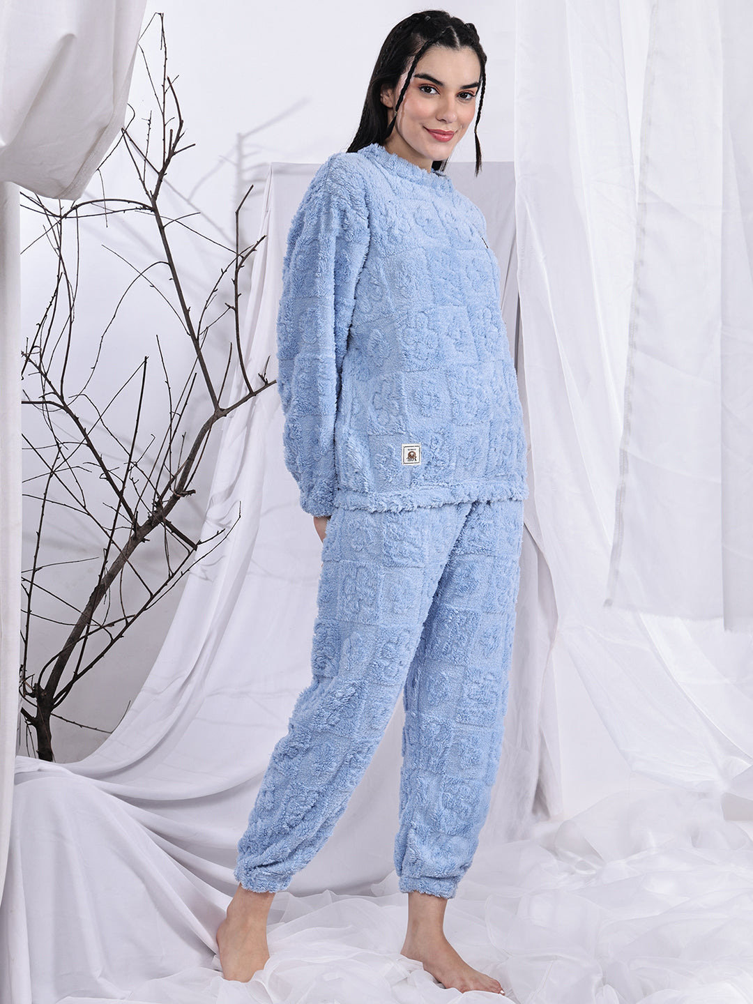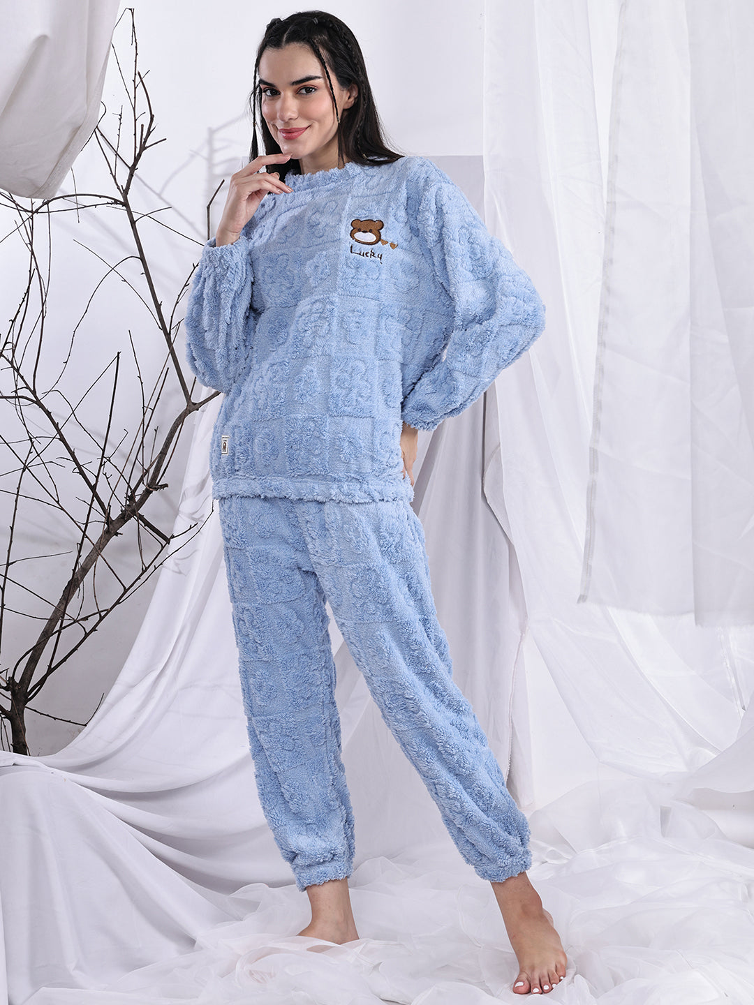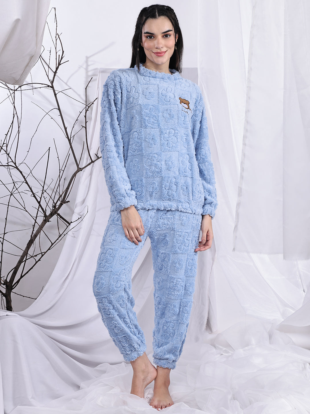 Wrap yourself in luxurious comfort with this plush fleece nightsuit in a beautiful shade of blue. This cosy two-piece set features a textured pattern throughout, creating a sophisticated yet relaxed look. The long-sleeve top is adorned with an adorable bear embroidery detail, adding a playful touch to the ensemble. The matching jogger-style bottoms feature elastic cuffs for a snug fit. Crafted from soft, textured fleece material, this nightsuit offers warmth and comfort for lounging or sleeping. The elastic waistband ensures a comfortable fit, while the overall relaxed silhouette allows for easy movement. Perfect for chilly evenings or year-round comfort, this nightsuit combines style with functionality. The set is easy to care for and maintains its plush texture wash after wash. Available in various sizes, this nightwear set makes an excellent addition to your loungewear collection.