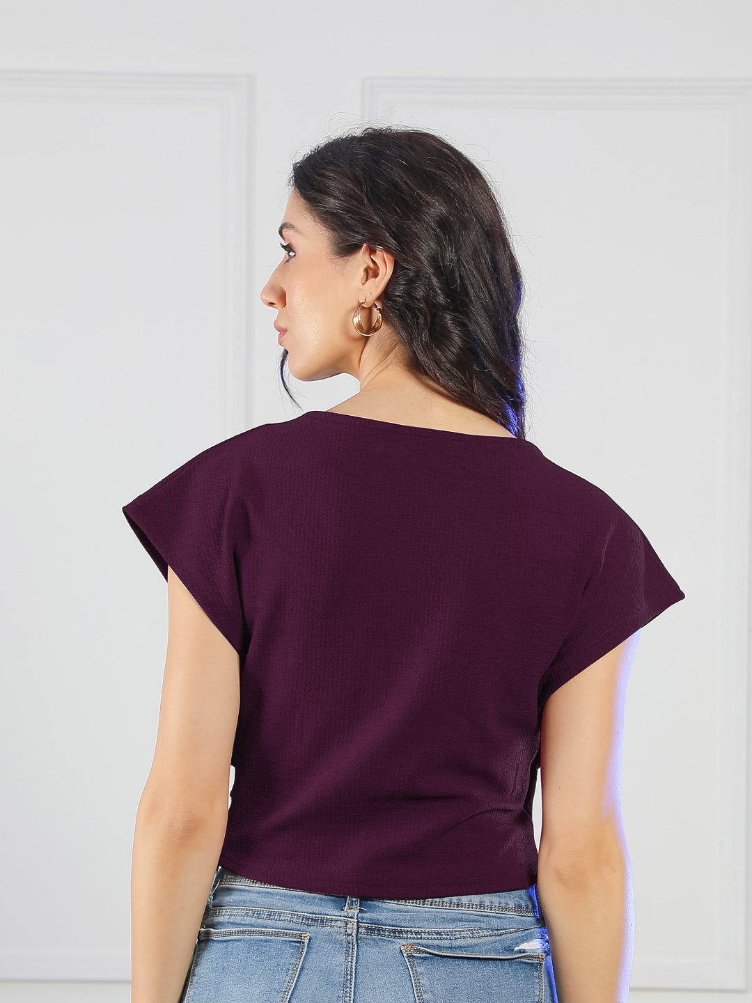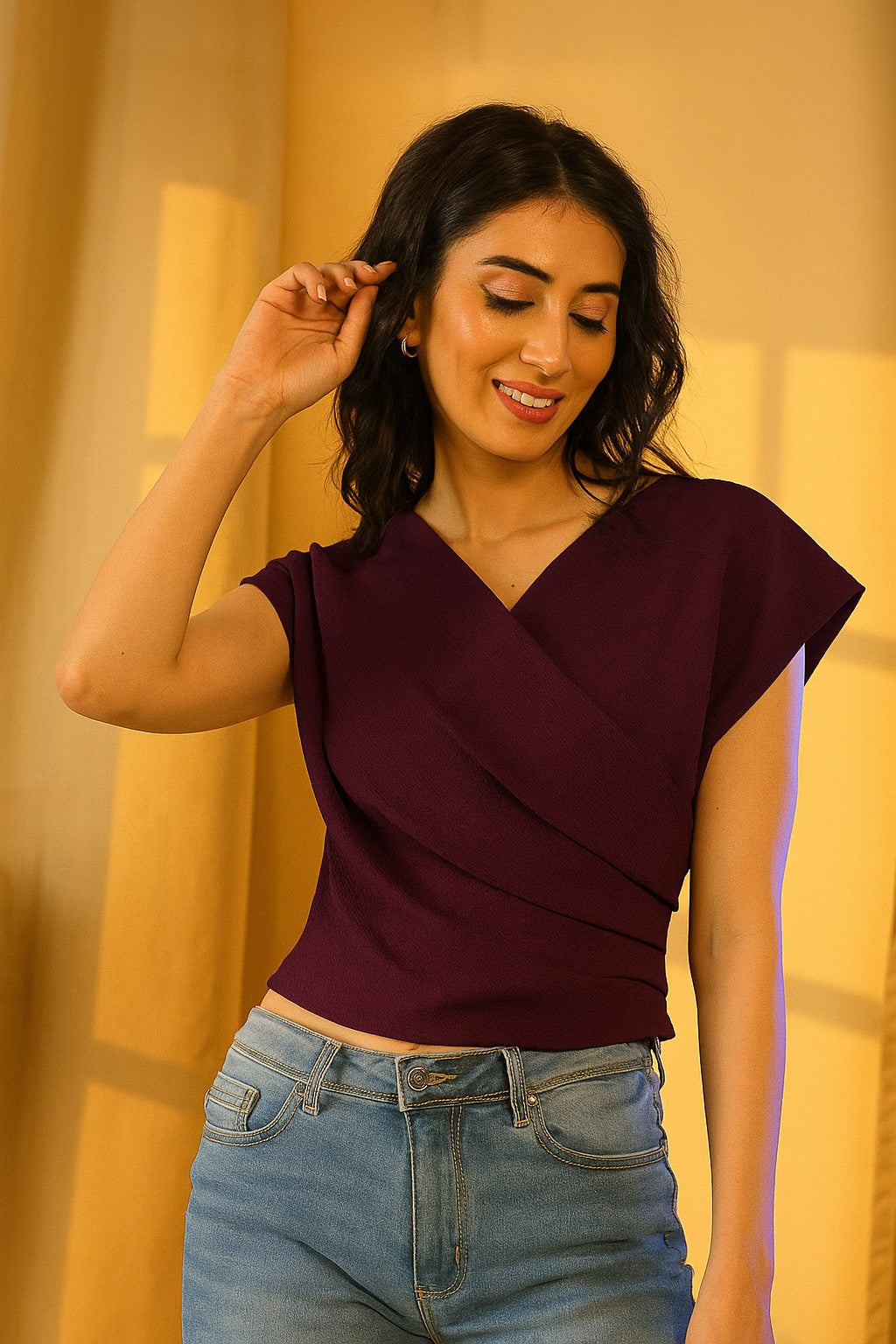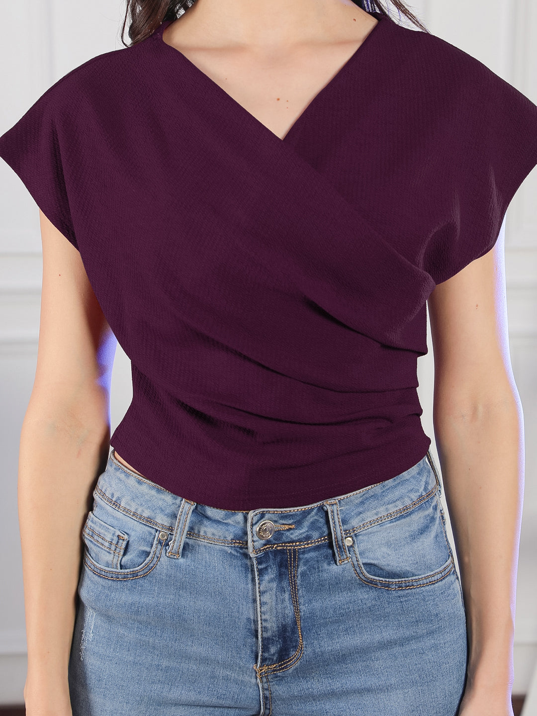 Women Polyester Knit Solid Fitted Overlap Top