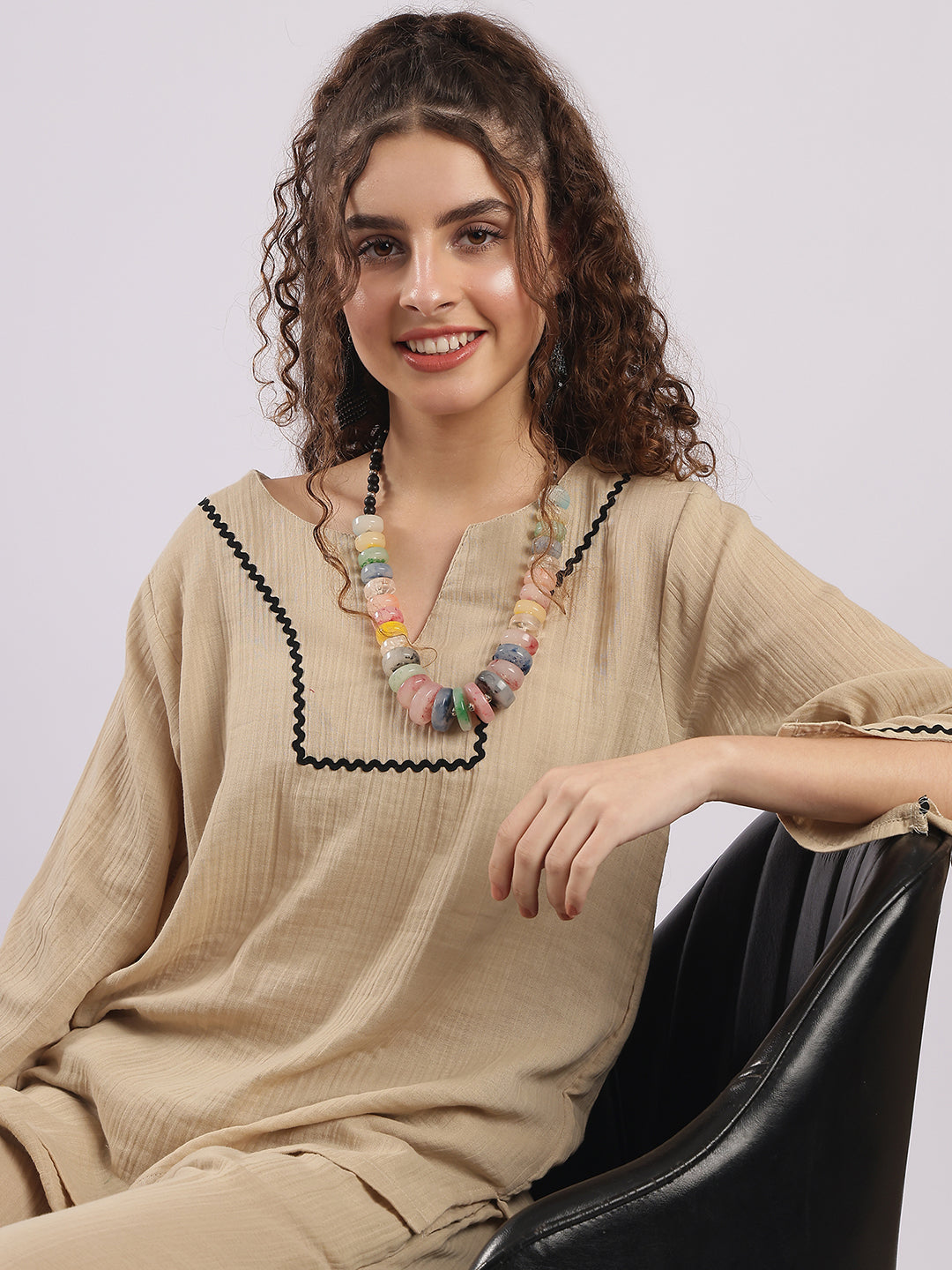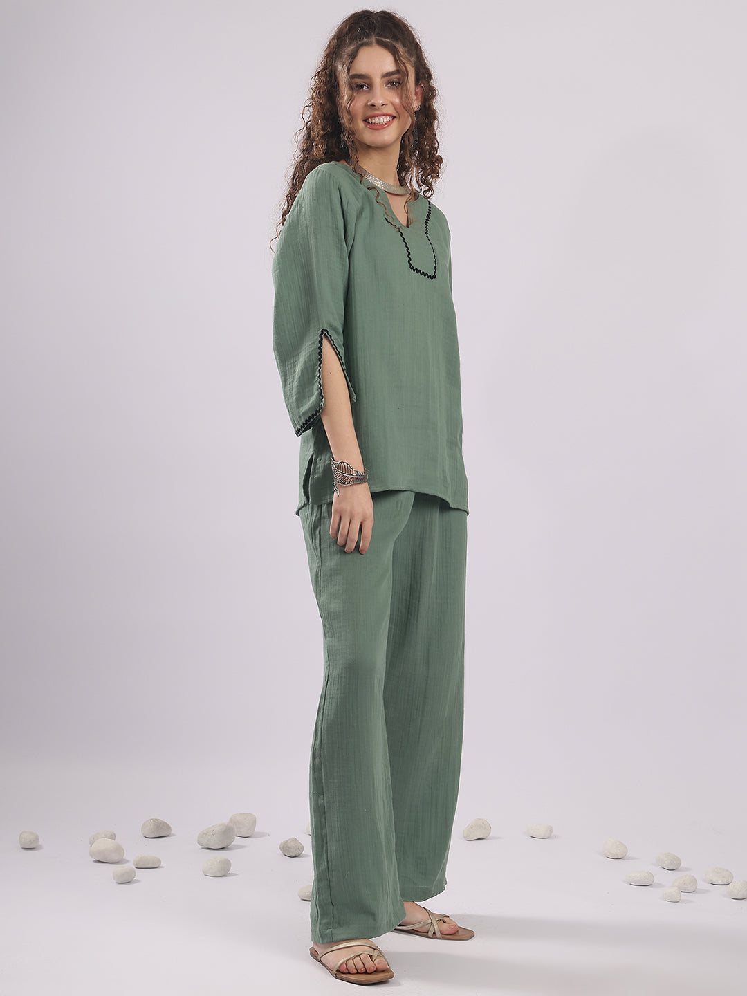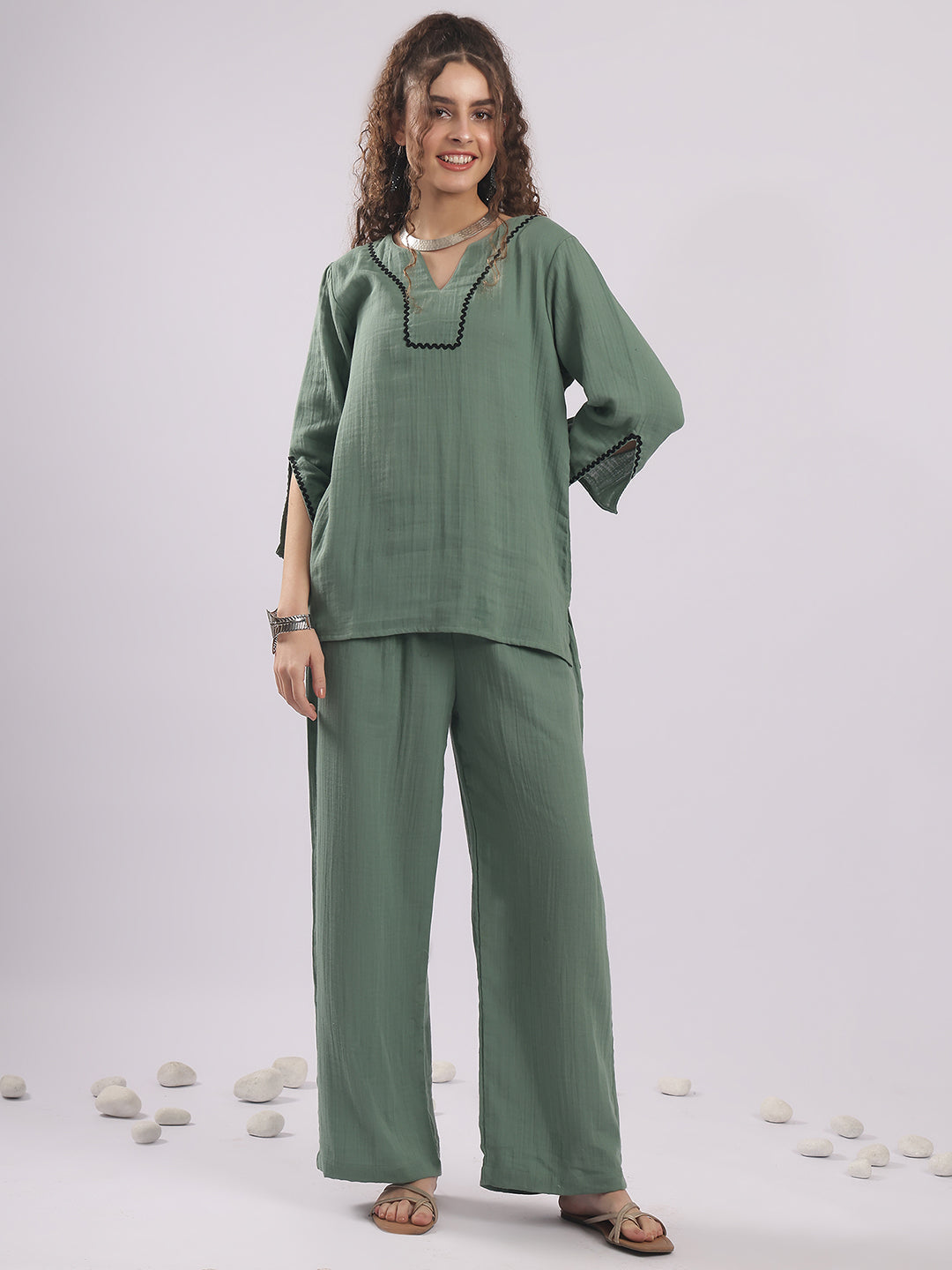 Women’s Solid Co-ord Set | V-Neck Tunic Top with Straight Fit Trouser