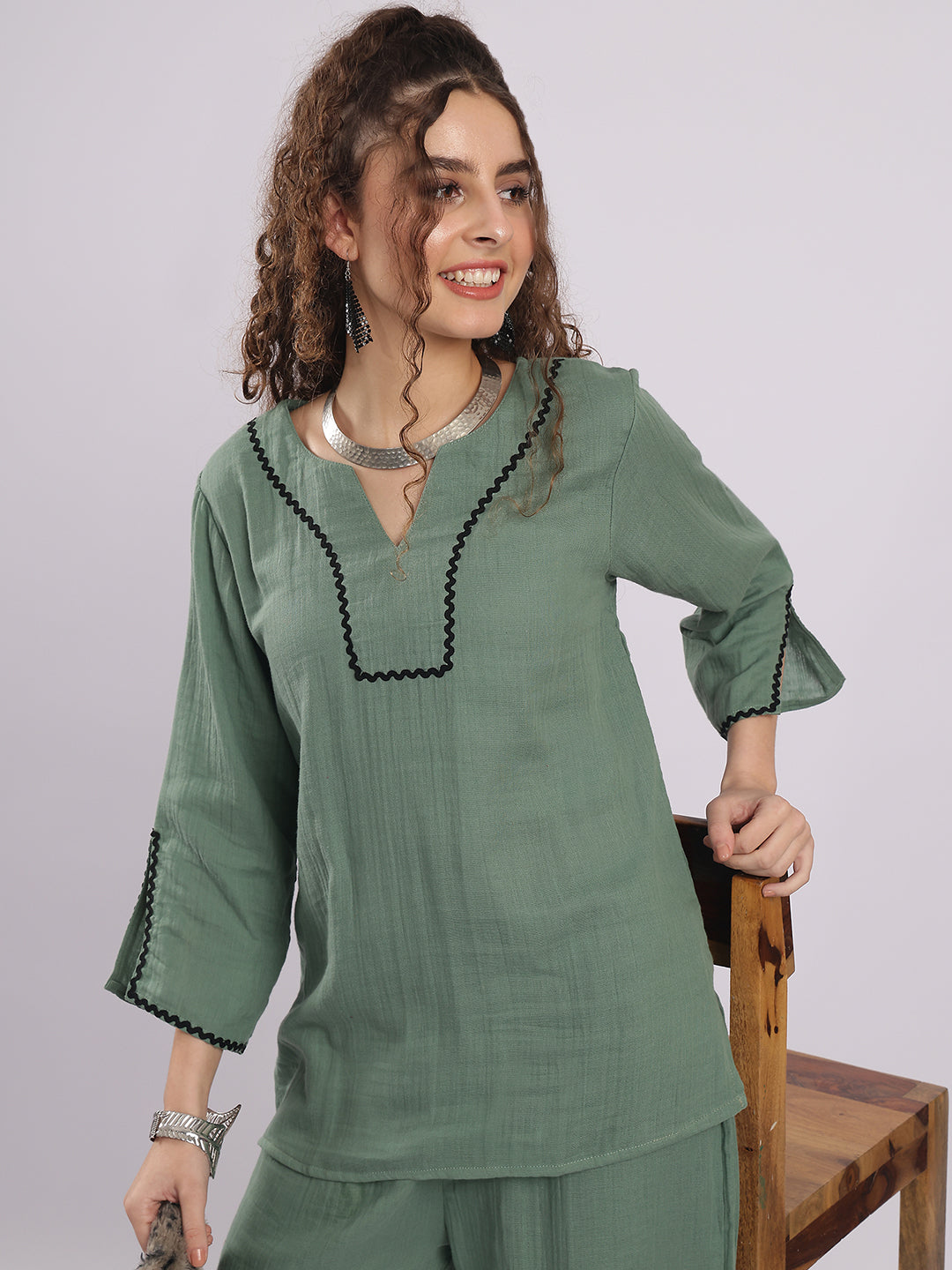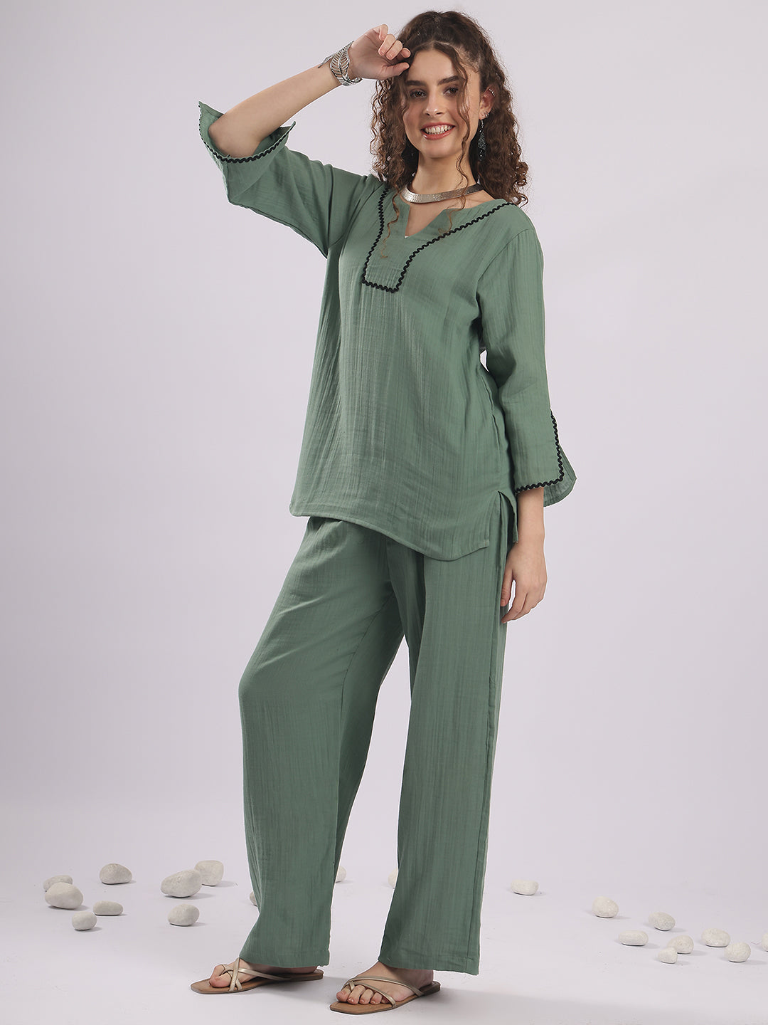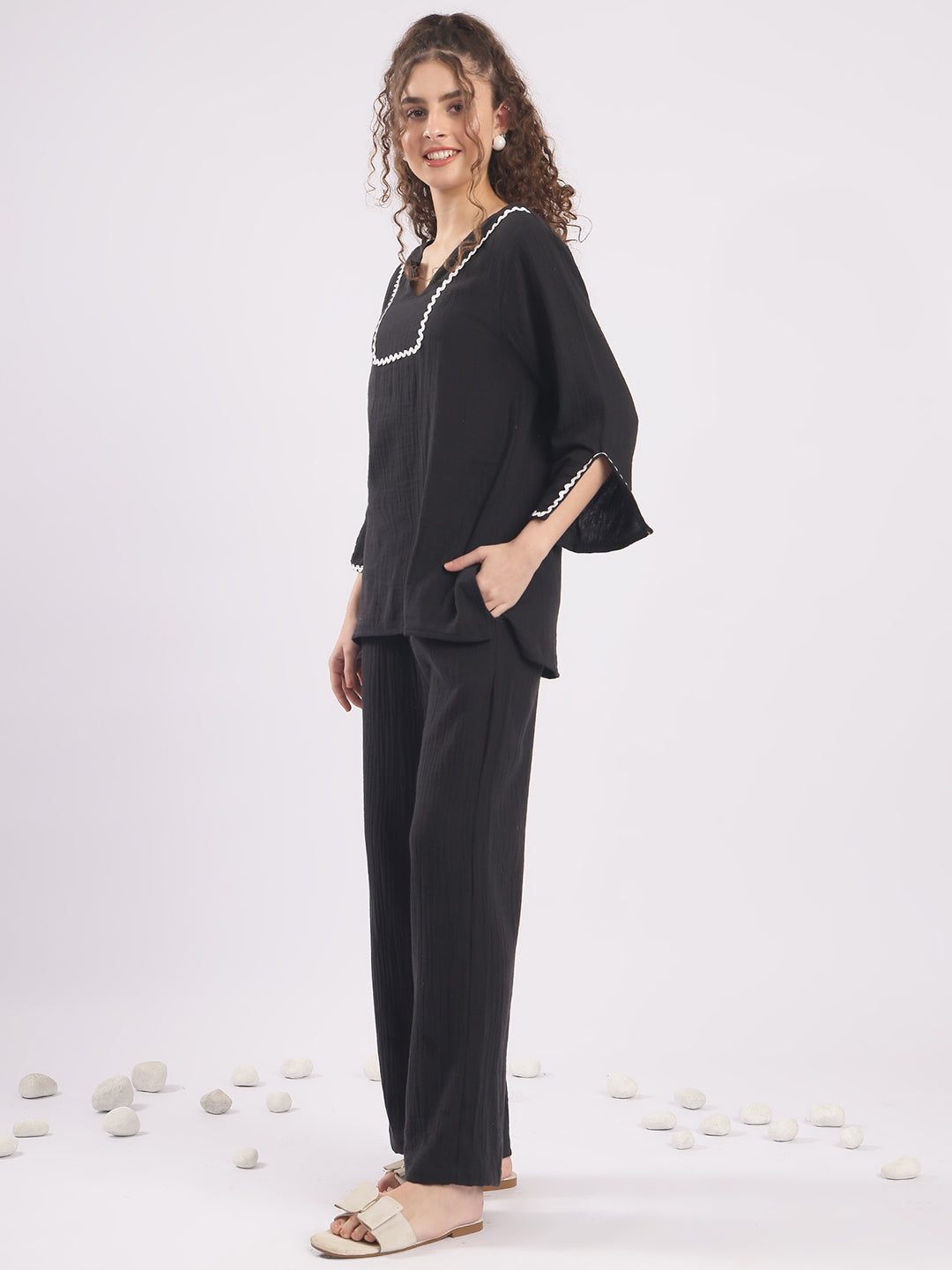 This Women’s Black Solid Co-ord Set, crafted for comfort with a touch of elegance. The tunic-style top features a flattering V-neckline enhanced with contrast lace detailing, while the straight-fit trousers offer a relaxed and polished silhouette. Designed for effortless styling, this co-ord set transitions seamlessly from casual daywear to relaxed evenings. Its minimalist design and timeless color make it a versatile addition to any modern wardrobe.